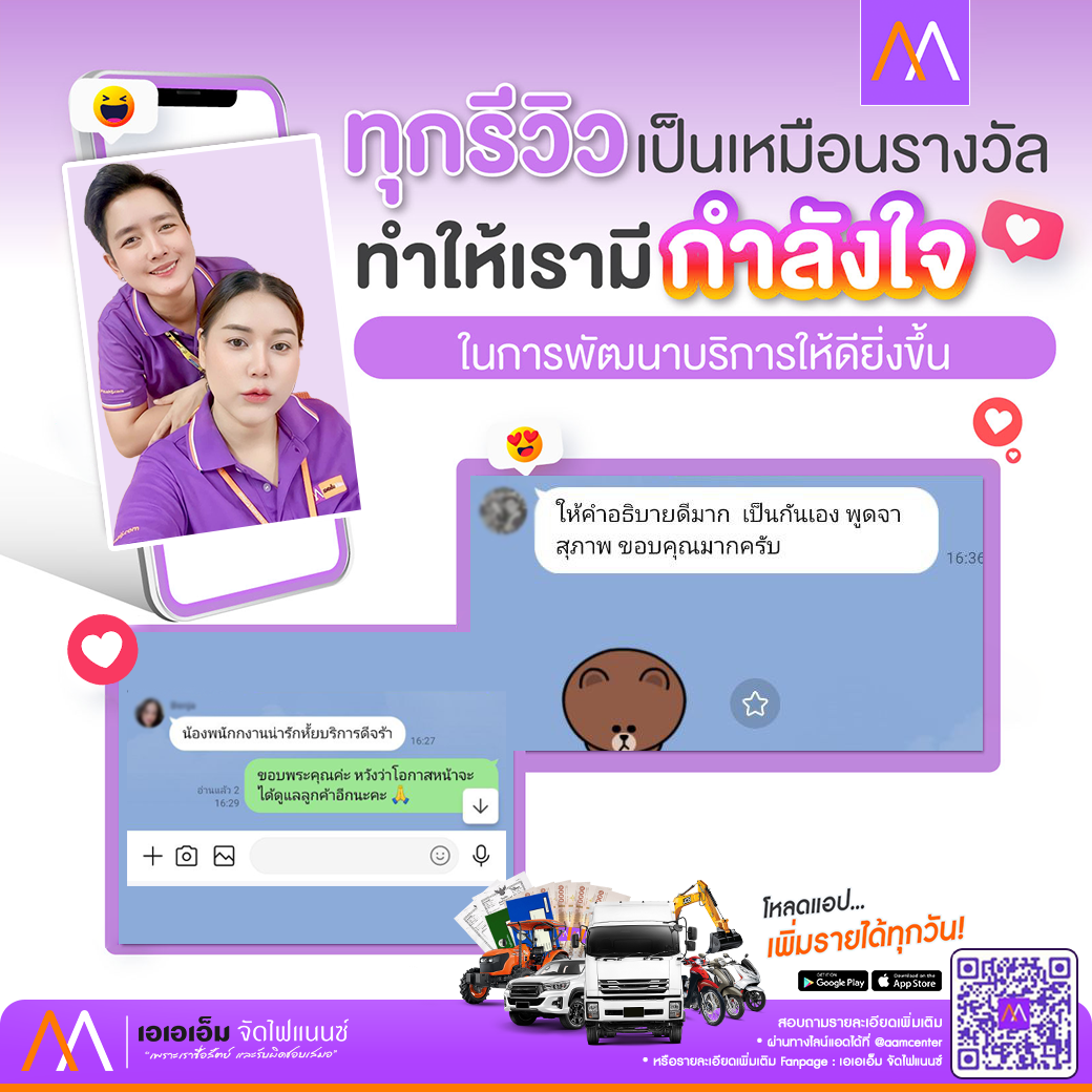 ติดต่อช่องทางอื่นๆ เพิ่มเติมได้ที่โทรเข้ามาเลย : 0819455508 Line@ : @aamcenterApplication : รองรับทั้ง IOS และ Andorid เพียงค้นหาคำว่า เอเอเอ็ม จัดไฟแนนซ์