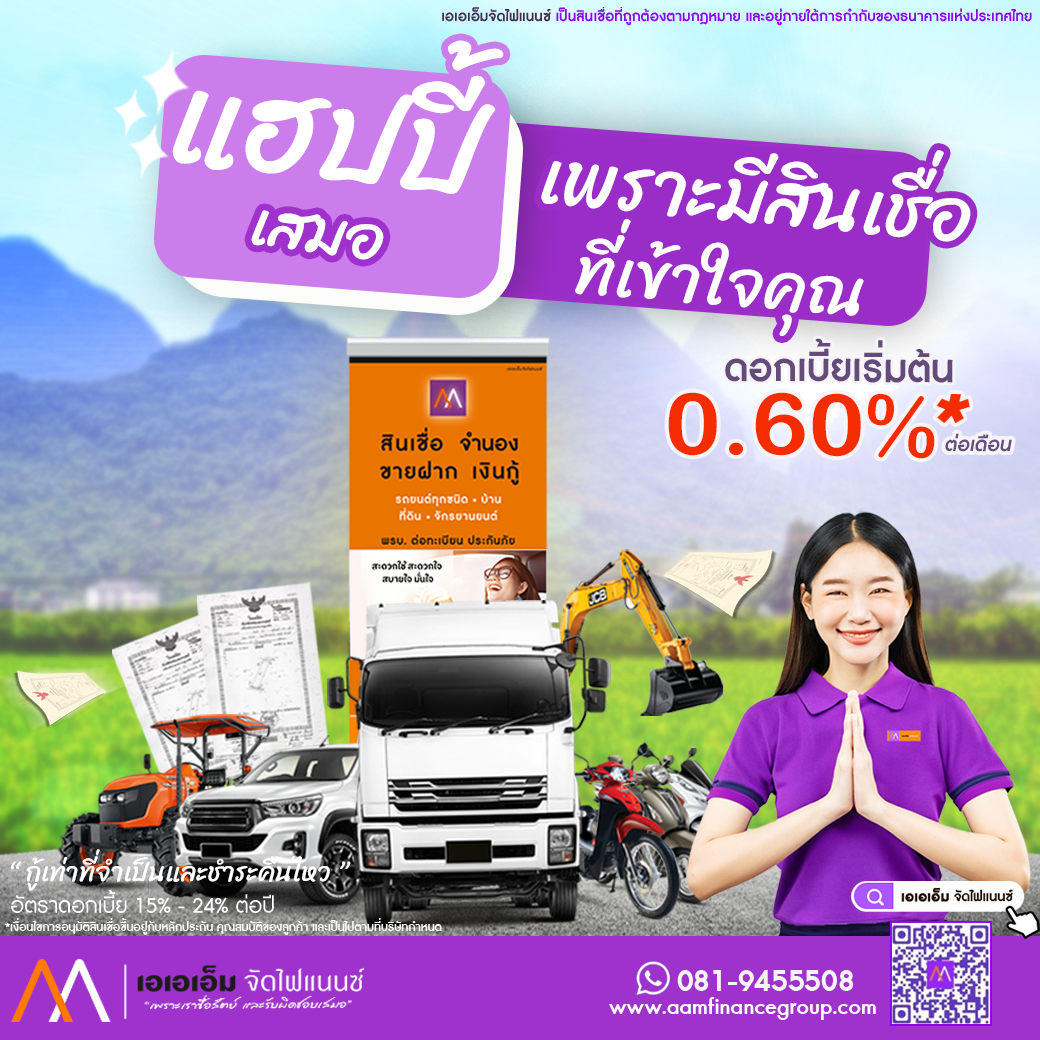ติดต่อช่องทางอื่นๆ เพิ่มเติมได้ที่โทรเข้ามาเลย : 0819455508 Line@ : @aamcenterApplication : รองรับทั้ง IOS และ Andorid เพียงค้นหาคำว่า เอเอเอ็ม จัดไฟแนนซ์