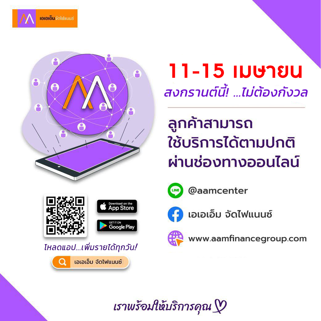 ติดต่อช่องทางอื่นๆ เพิ่มเติมได้ที่โทรเข้ามาเลย : 0819455508 Line@ : @aamcenterApplication : รองรับทั้ง IOS และ Andorid เพียงค้นหาคำว่า เอเอเอ็ม จัดไฟแนนซ์