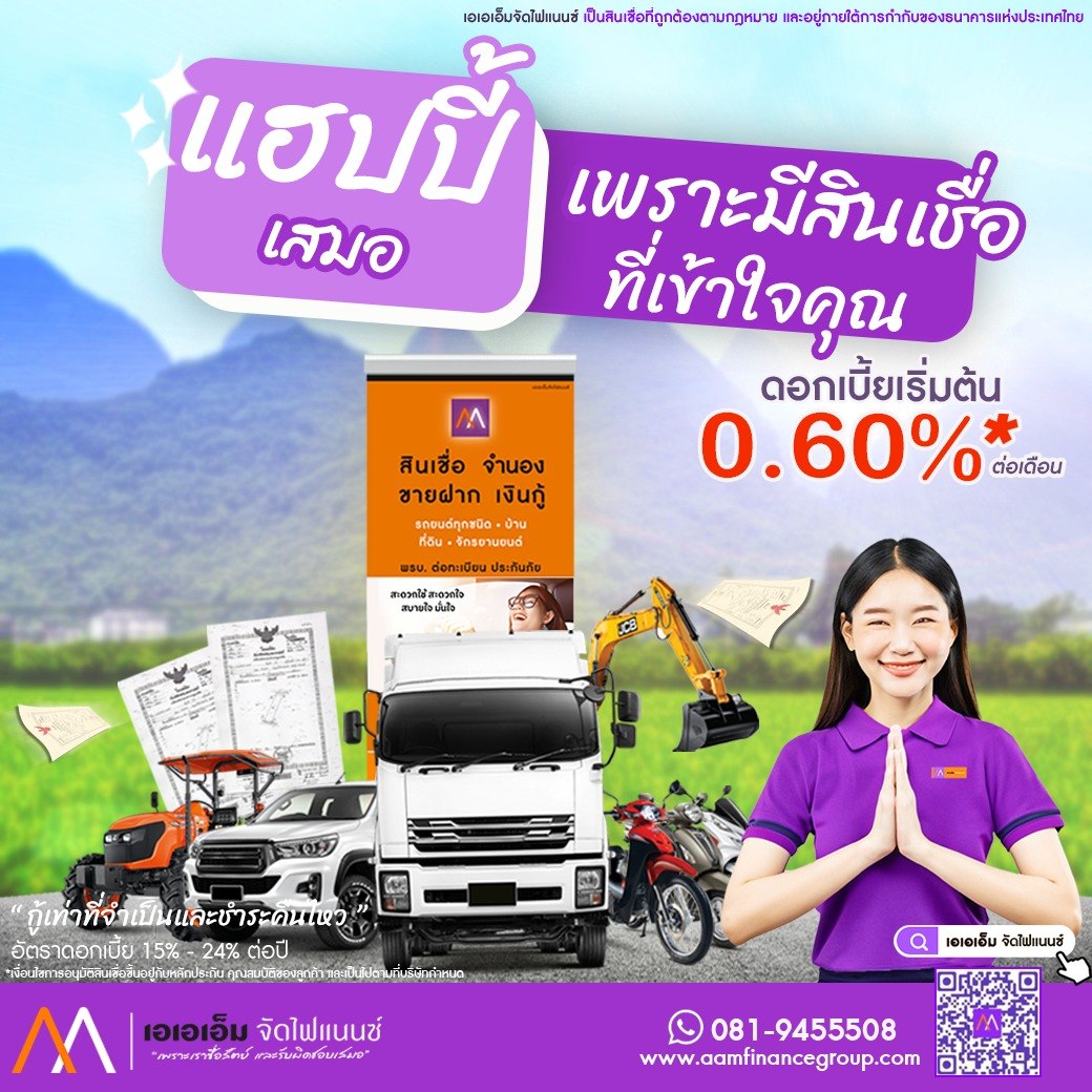 ติดต่อช่องทางอื่นๆ เพิ่มเติมได้ที่โทรเข้ามาเลย : 0819455508 Line@ : @aamcenterApplication : รองรับทั้ง IOS และ Andorid เพียงค้นหาคำว่า เอเอเอ็ม จัดไฟแนนซ์