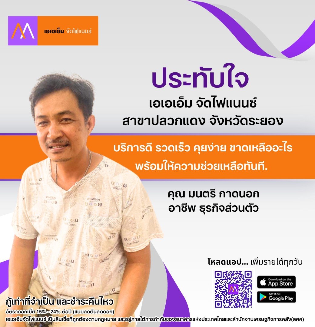 ขอบคุณ เอเอเอ็ม จัดไฟแนนซ์ สาขาปลวกแดง ที่บริการด้วยใจ รวดเร็ว และใส่ใจทุกรายละเอียด ลูกค้าสบายใจได้ทุกคำถาม และข้อสงสัย พร้อมให้คำปรึกษา และช่วยเหลือทันที